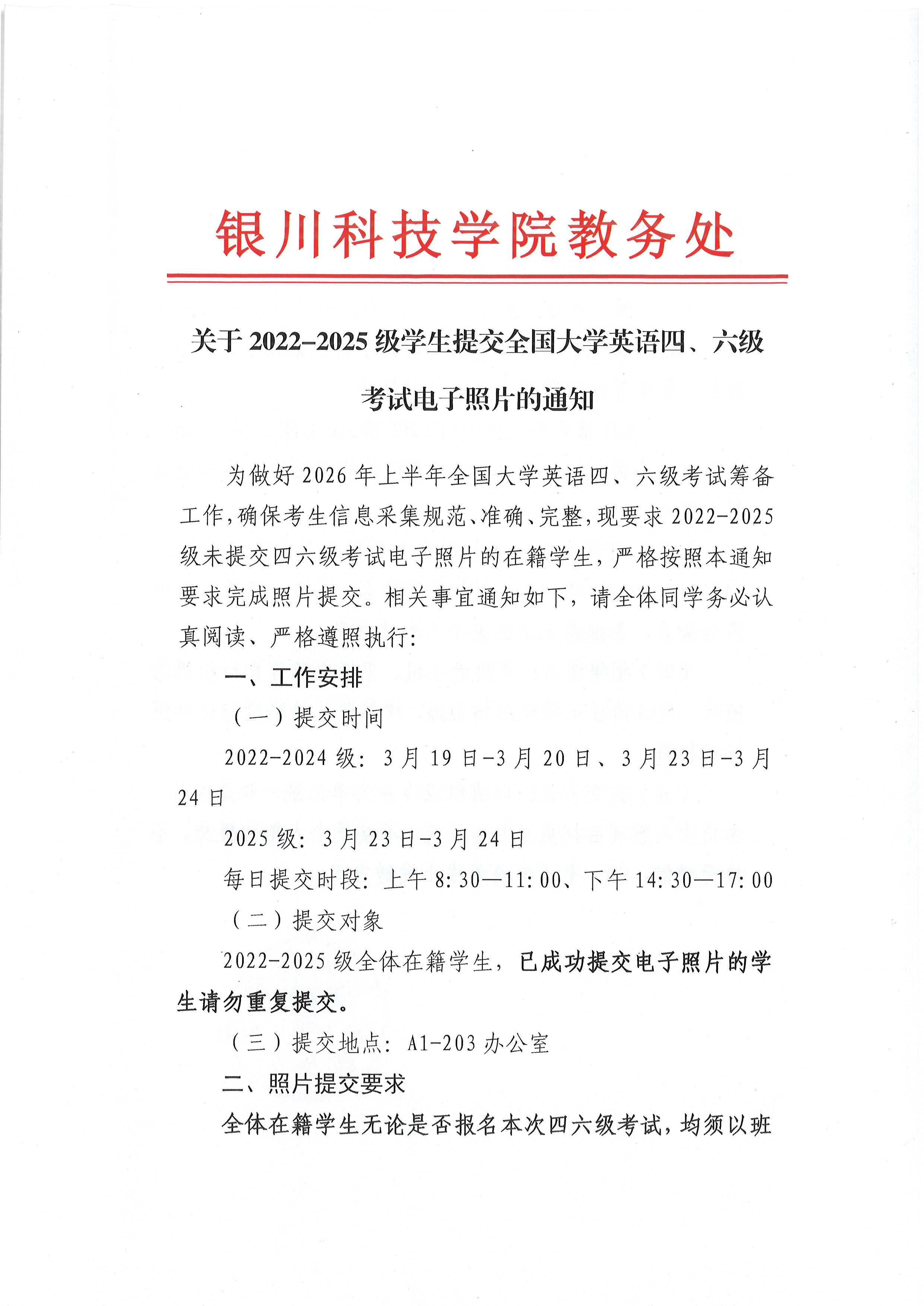 关于2022-2025级学生提交全国大学英语四、六级考试电子照片的通知