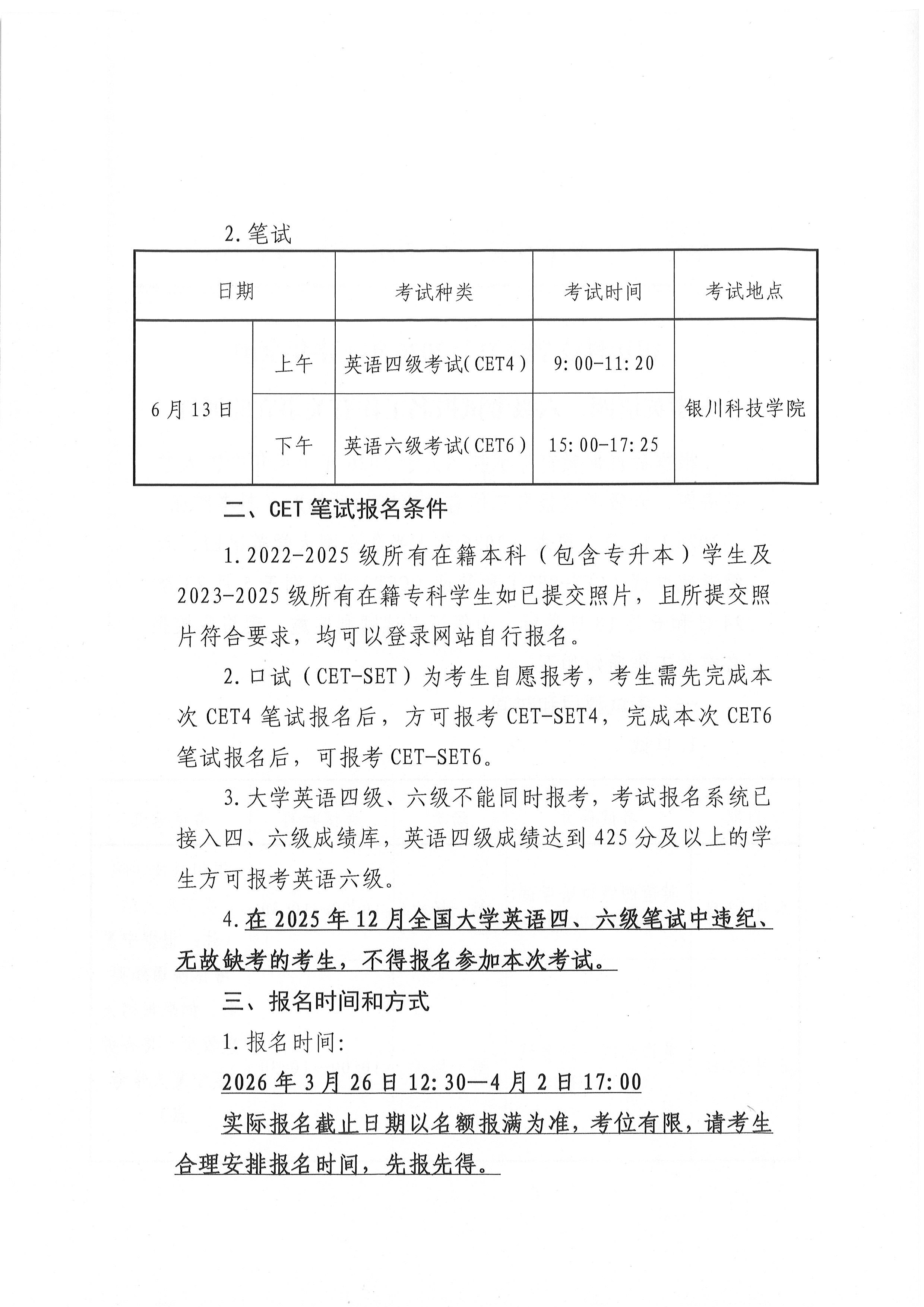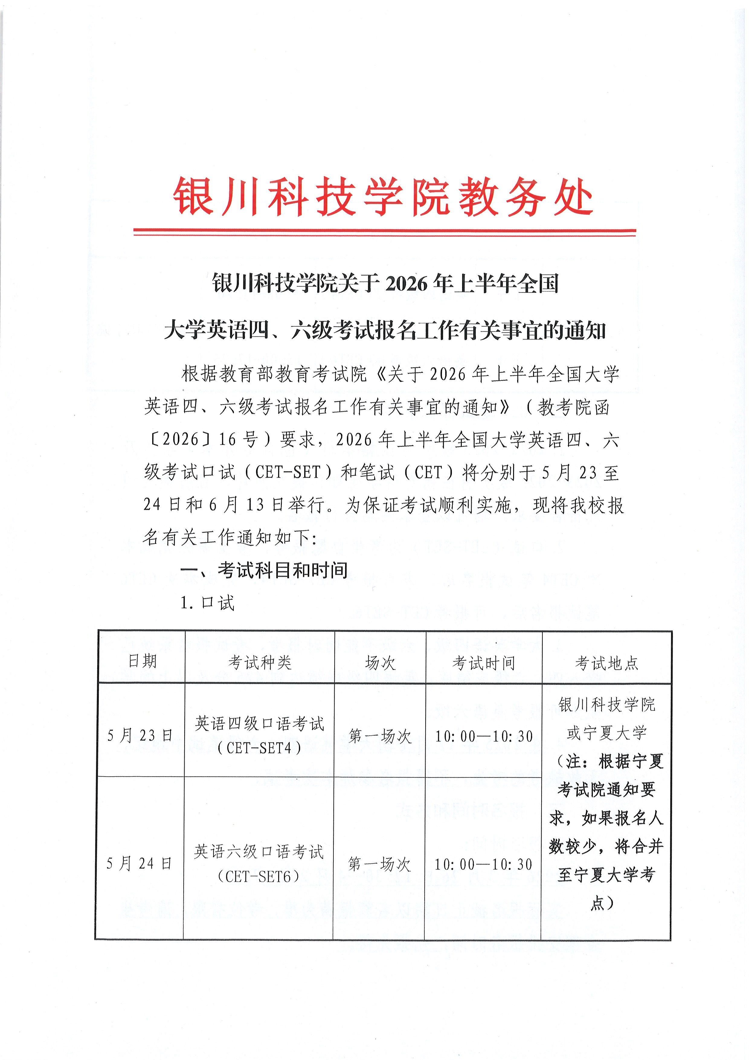 银川科技学院关于2026年上半年全国 大学英语四、六级考试报名工作有关事宜的通知